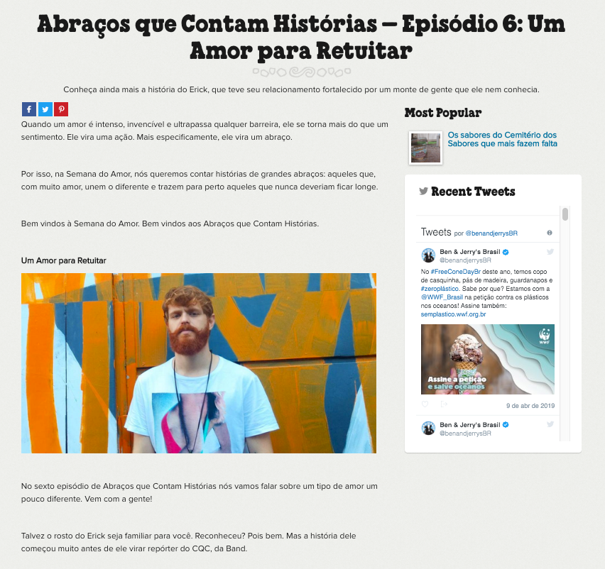 Buscamos ouvir dos nossos fãs nas redes sociais suas histórias de amor. Escolhemos a Lilian e Camila (namoradas); Vinicius e Elias (pai e filho), Matheus e Carol (irmãos); Antonia e Antonio (mae e filho), Erick e Zé e Nicolas (se casaram na loja Ben & Jerry’s).
